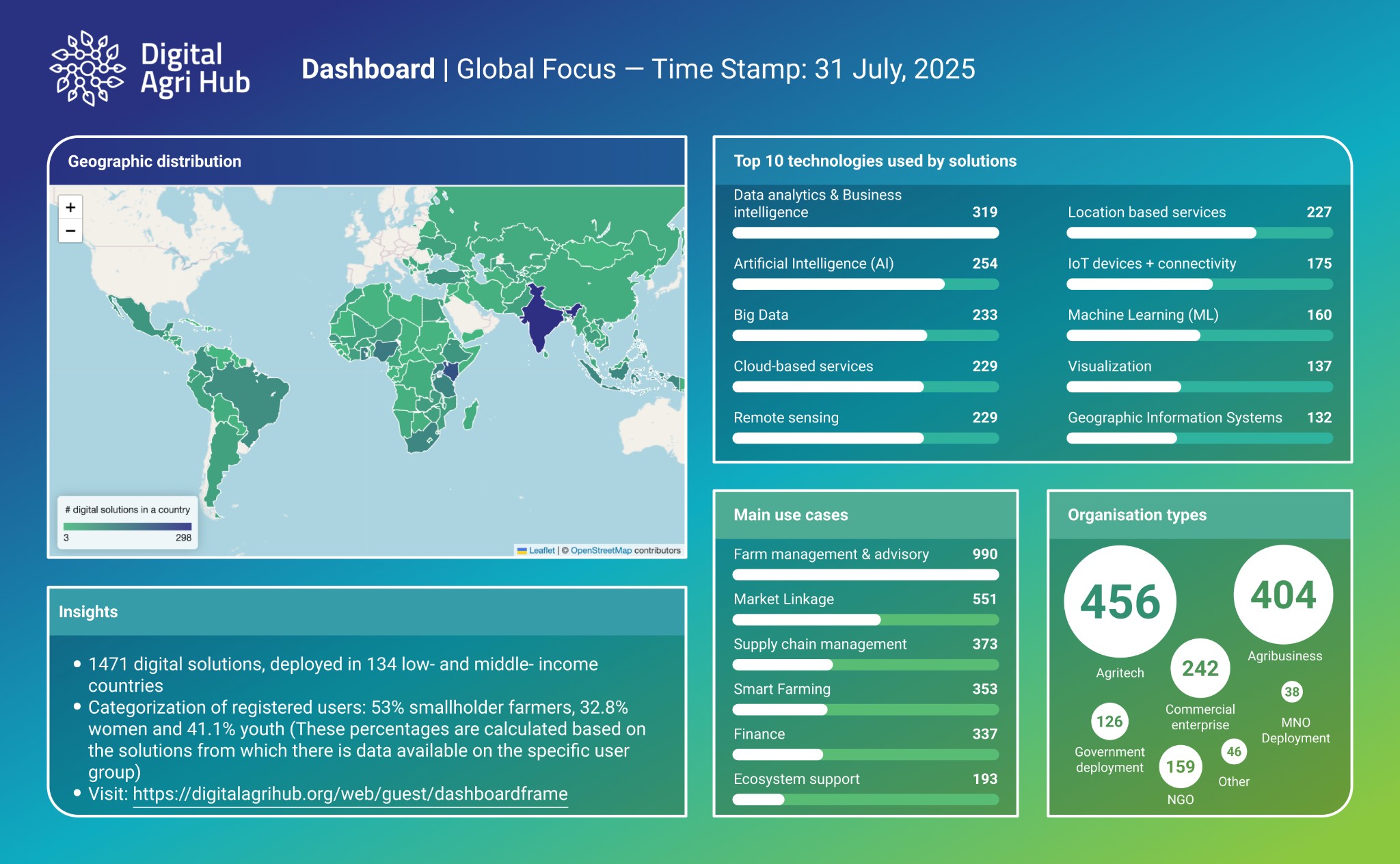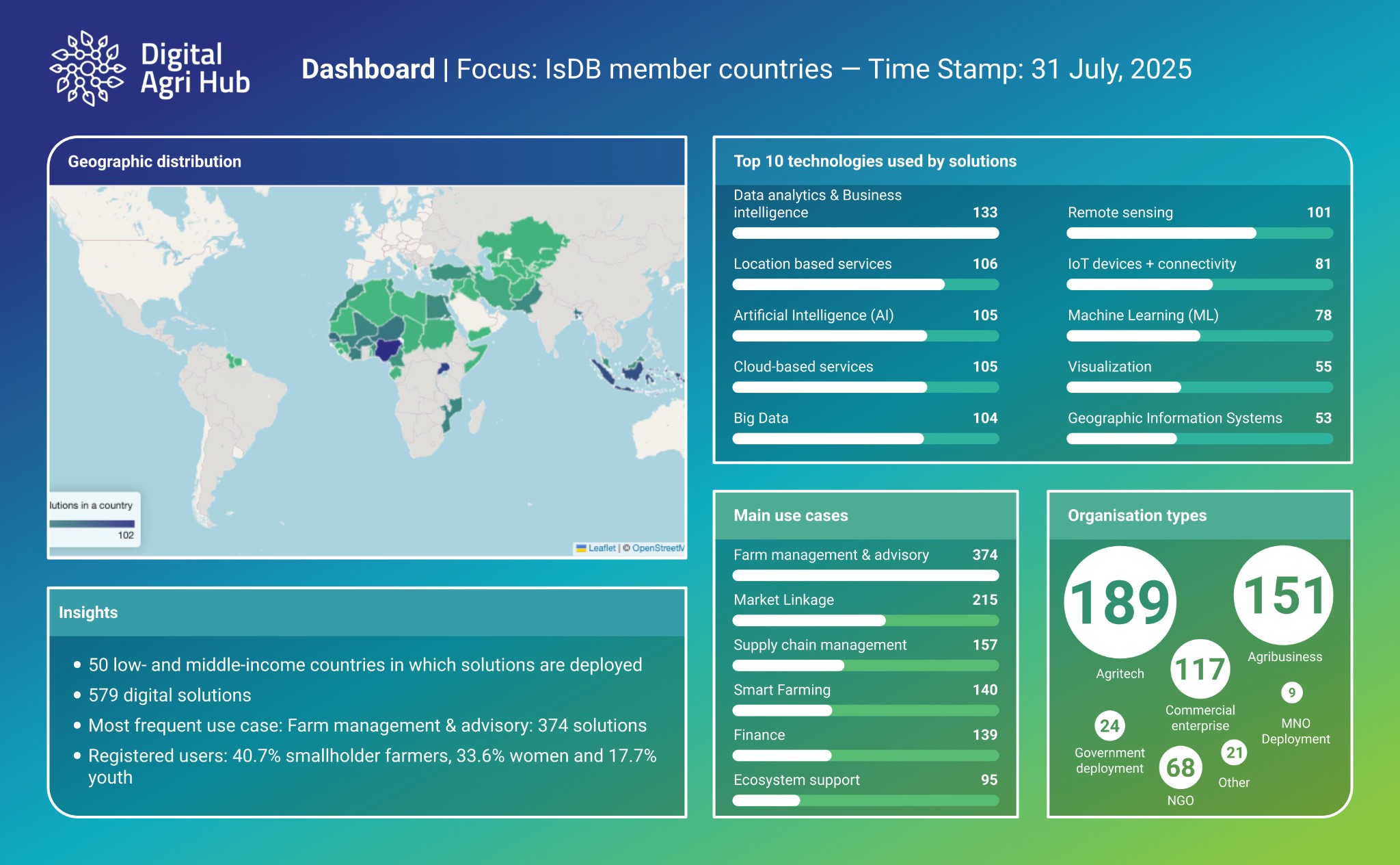 At this level, users can explore how digital agriculture is evolving across regions, with detailed data on the prevalence of specific technologies, delivery channels, and organisation types operating in these areas. The dashboards also showcase region-specific use cases, shedding light on how digital innovations are being adapted to support farmers, agribusinesses, and value chains across diverse contexts.