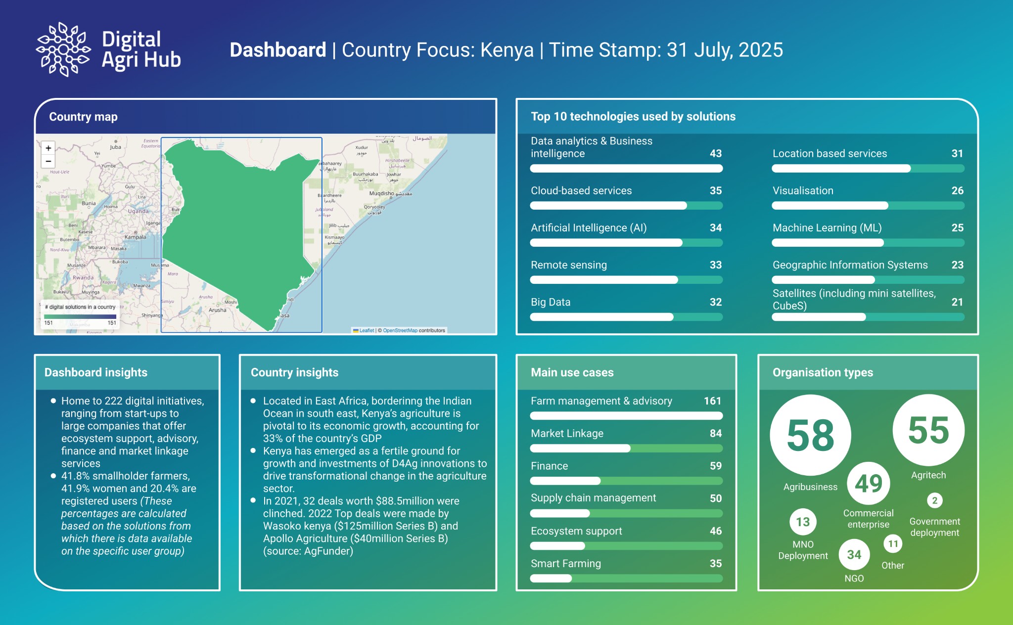 Examine focused dashboards that highlight the digital agriculture landscape within individual countries.